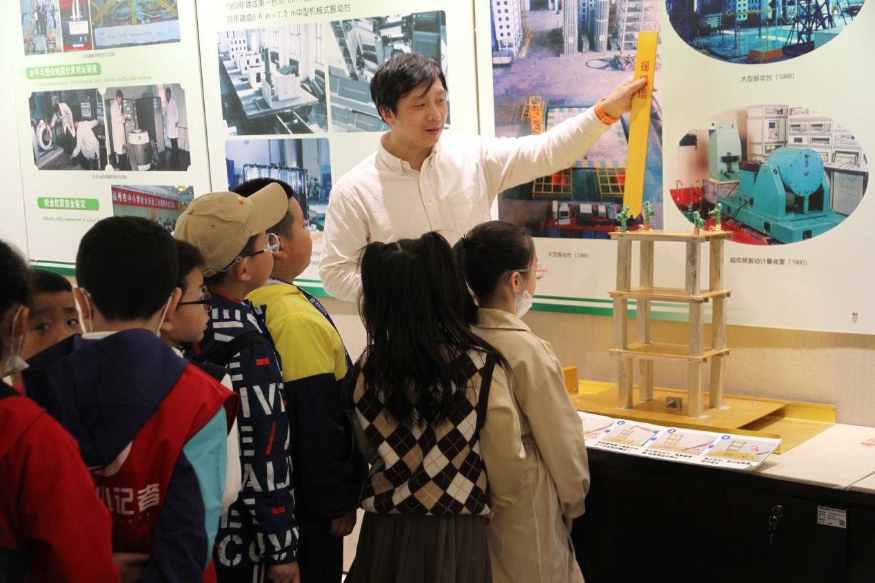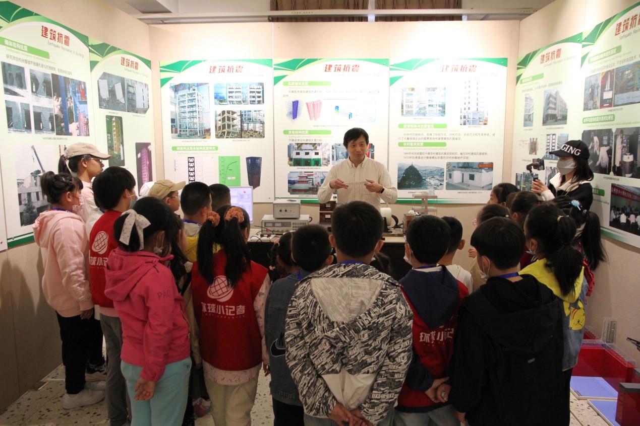 講座結束后,張昊宇副研究員帶領小記者們參觀并實踐了一系列的科普實驗。來到鐵路地震監(jiān)測預警系統(tǒng)展臺,了解地震后該系統(tǒng)如何保障高鐵安全運行的原理。通過學習和思考,小記者們提出許多問題,例如“中國古建筑為何能夠跨越千年不倒”,張昊宇結合提問講解了中國傳統(tǒng)木結構的抗震機理知識。最受小記者們歡迎的還是微型振動臺模擬實驗和搖擺墻結構無損倒塌模型實驗。每一位小記者都親手操作搖擺墻結構無損倒塌模型,近距離直觀地認識到不同建筑結構抗震能力的強弱區(qū)別,學習了建筑結構抗震的基本知識。