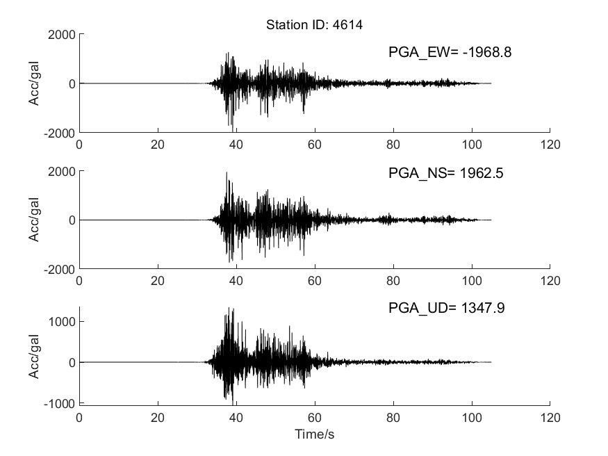 地震后強(qiáng)震動(dòng)觀測(cè)中心收集獲取了距震中483公里范圍內(nèi)強(qiáng)震動(dòng)記錄263組,并迅速組織人員進(jìn)行處理。獲取記錄臺(tái)站加速度記錄分析結(jié)果見表1(節(jié)選部分),其中4614臺(tái)PGA峰值最大,其震中距為42.4km,東西、南北、垂直向加速度峰值分別為-1968.8cm/s2、1962.5cm/ s2、1347.9cm/ s2,東西、南北、垂直向速度峰值分別為-51.3cm/s、66.8cm/s、-28.5cm/s,計(jì)算儀器地震烈度9.5度。
