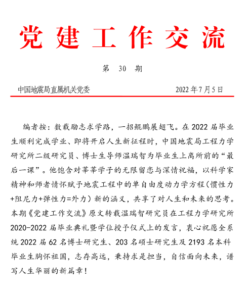 6月28日,溫瑞智研究員在我所2020-2022屆畢業典禮暨學位授予儀式上作了題為《共守初心 不懈奮斗——畢業生離所前的“最后一課”》的發言。該發言被中國地震局直屬機關黨委《黨建工作交流》第30期原文轉載,并以此文祝愿全系統畢業生胸懷祖國、志存高遠、秉持求是擔當,自信面向未來,譜寫人生華麗的新篇章。