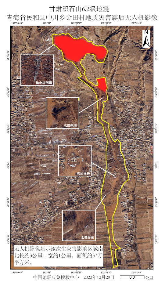 發布時間: 2023-12-25 點擊數量:68192023年12月18日23時59分,甘肅省臨夏積石山縣發生6.2級地震。此次地震已造成部分房屋損毀甚至倒塌,并由此造成人員傷亡。除房屋倒塌外,此次地震在青海省海東市民和縣中川鄉金田村和草灘村引發了被稱之為“砂涌”的特殊現象,區域內部分房屋被厚達數米的流滑土壤掩埋(圖1)。