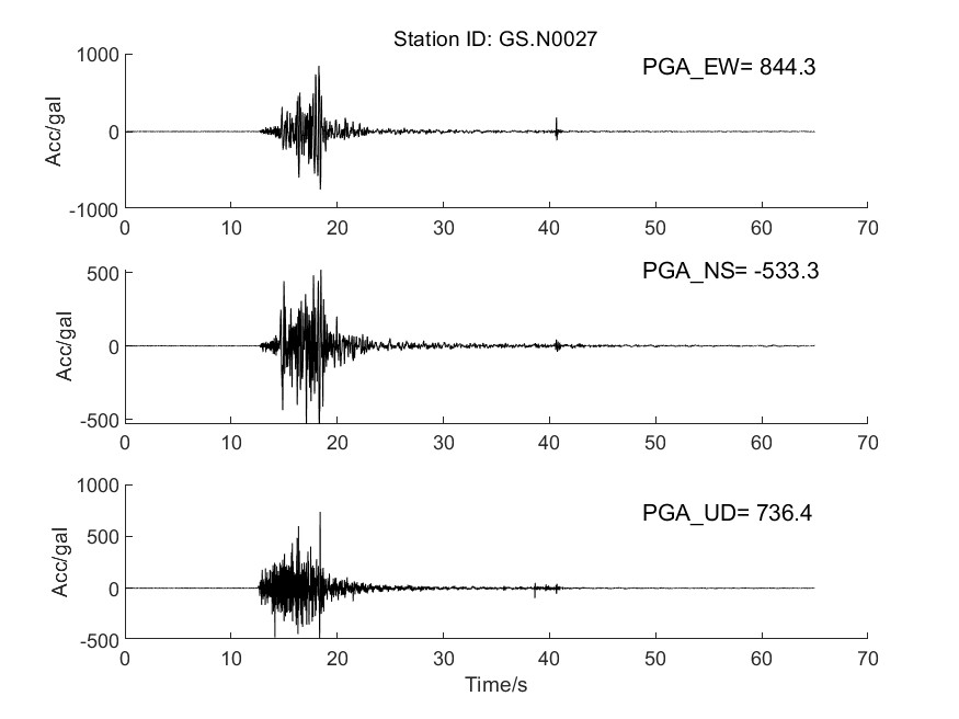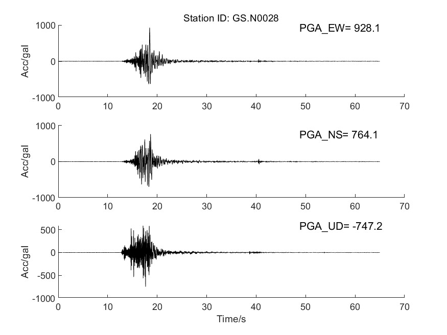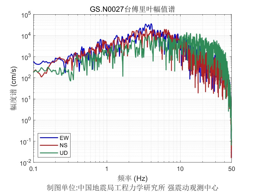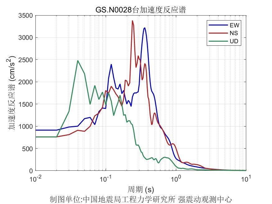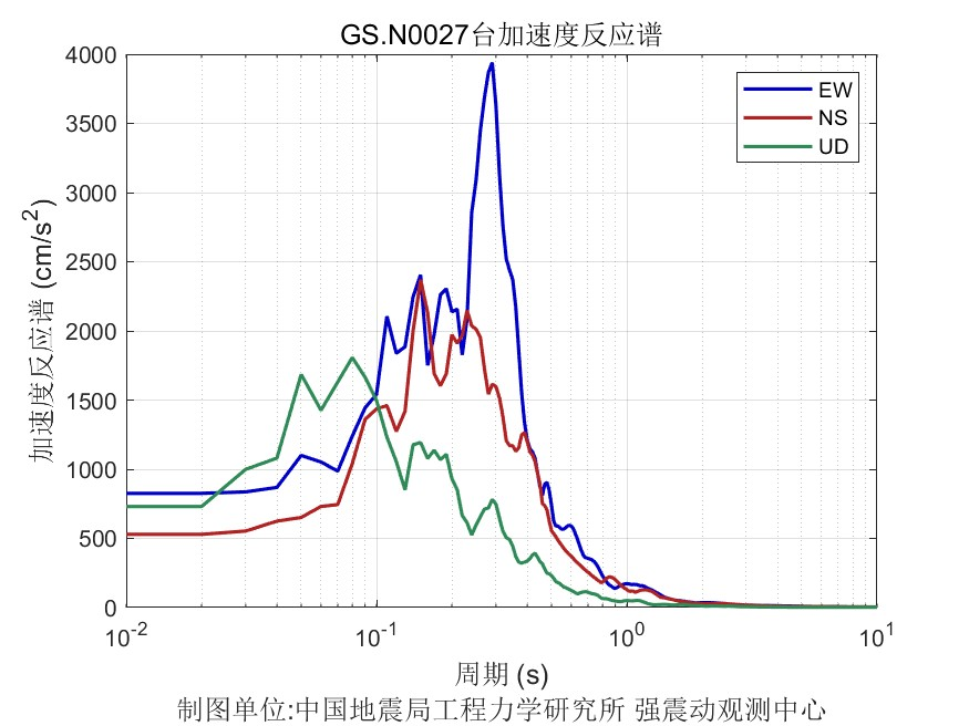 地震后工力所強震動觀測中心共收取距震中100公里范圍內實時強震儀記錄57組、烈度儀記錄181組。中心立即組織人員進行處理。獲取記錄臺站加速度記錄分析結果見表1,其中GS.N0028 臺烈度最大,其震中距為13.6km,東西、 南北、 垂直向加速度峰值分別為 905.8cm/s2、778.5cm/ s2、-702.4cm/ s2,東西、南北、垂直向速度峰值分別為57.3cm/s、-52.1cm/s、-16.3 cm/s,計算儀器地震烈度9.5度。GS.N0027臺震中距最小,其震中距為5.8km,東西、南北、垂直向加速度峰值分別為823.9cm/s2、-533.3cm/ s2、 692.7cm/ s2,東西、南北、垂直向速度峰值分別為-39.8cm/s、-28.9cm/s、-11.3 cm/s,計算儀器地震烈度8.8度。儀器地震烈度分布圖見圖1,地震峰值加速度分布圖見圖2,地震峰值速度分布見圖3,地震加速度反應譜(T=0.3s、T=1.0s、T=3.0s)分布圖見圖4、圖5、圖6,GD.Q0407 臺強震動記錄見圖7,GD.Q0407臺加速度反應譜見圖8,GD.Q0407臺傅里葉幅值譜見圖9,GD. J8501臺強震動記錄見圖10,GD. J8501臺加速度反應譜見圖11,GD. J8501臺傅里葉幅值譜見圖12。