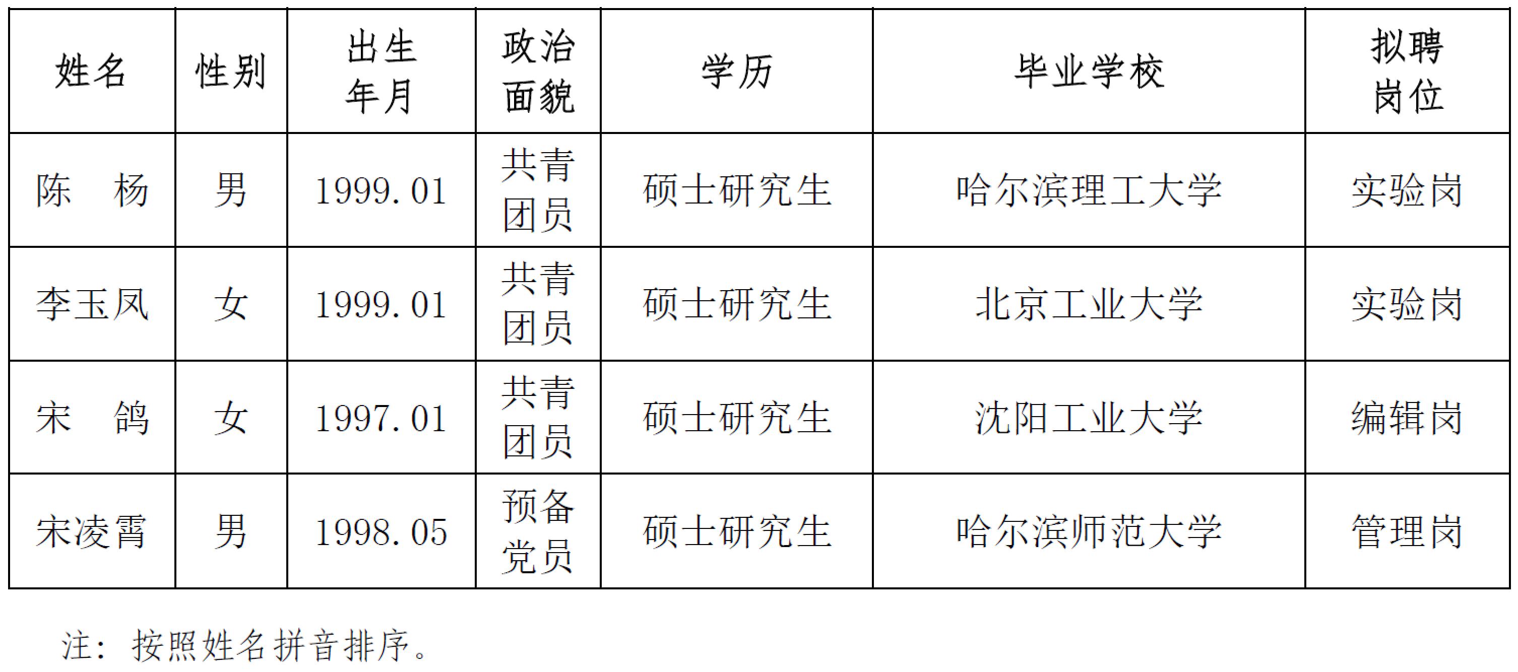 發布時間: 2024-05-14 點擊數量:13068根據中國地震局《關于貫徹執行〈事業單位公開招聘人員暫行規定〉的通知》文件精神和我所用人計劃,經公開發布招聘信息、資格審查、面試等程序確定擬錄人員。現將擬錄人員相關情況公示如下,公示期7個工作日,期間如有異議請與中國地震局工程力學研究所人才資源部或紀檢室聯系,以個人名義反映情況的領署真實姓名,以單位名義反映情況的須加蓋公章。