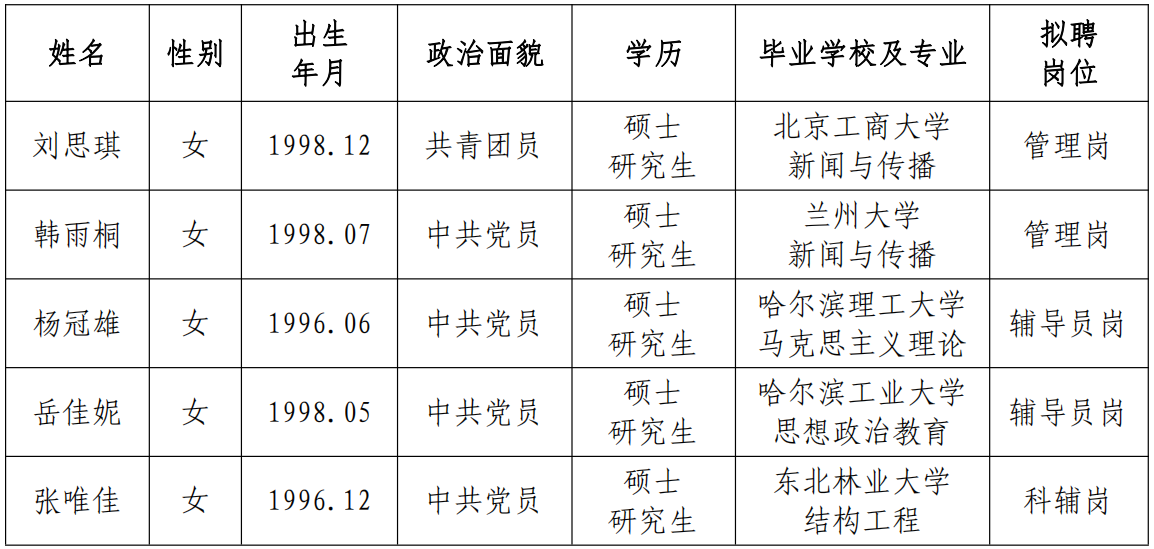 發(fā)布時(shí)間: 2022-03-28 點(diǎn)擊數(shù)量:12019根據(jù)中國(guó)地震局《關(guān)于貫徹執(zhí)行<事業(yè)單位公開(kāi)招聘人員暫行規(guī)定>的通知》文件精神和我所用人計(jì)劃,經(jīng)公開(kāi)發(fā)布招聘信息、資格審查、面試等程序確定擬錄人員。現(xiàn)將擬錄人員相關(guān)情況公示如下,公示期7天,期間如有異議請(qǐng)與中國(guó)地震局工程力學(xué)研究所人才資源部或紀(jì)檢室聯(lián)系,以個(gè)人名義反映情況的須署真實(shí)姓名,以單位名義反映情況的須加蓋公章。